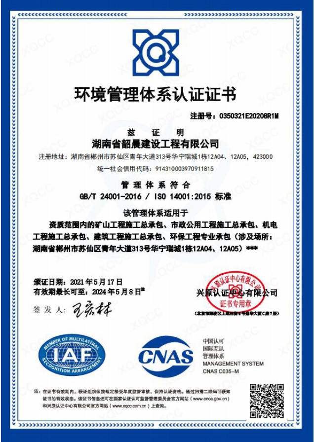 環(huán)境管理體系認證證書