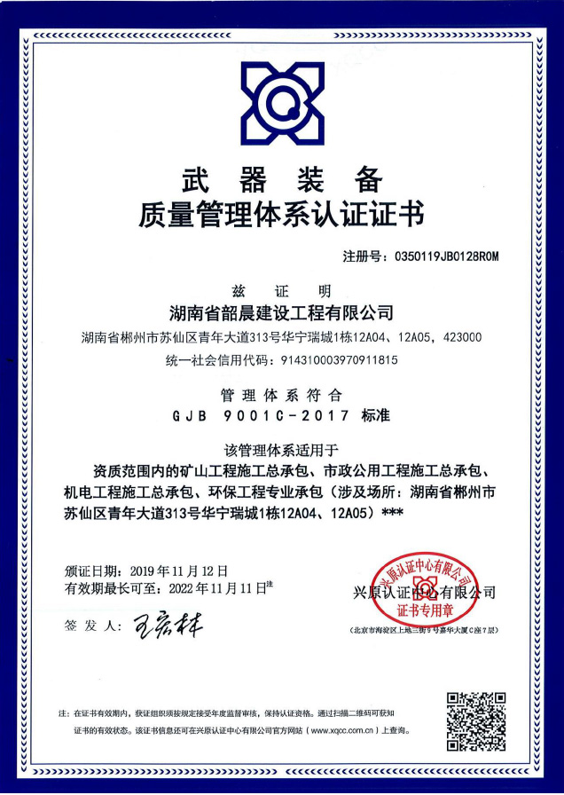 武器裝備質(zhì)量管理體系認(rèn)證證書